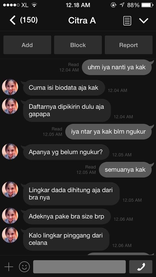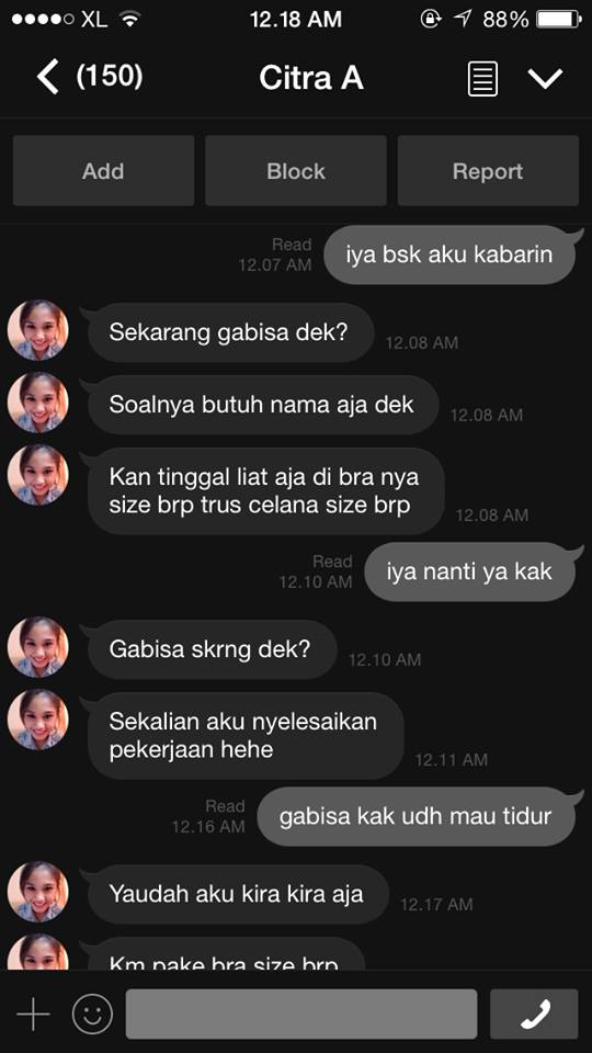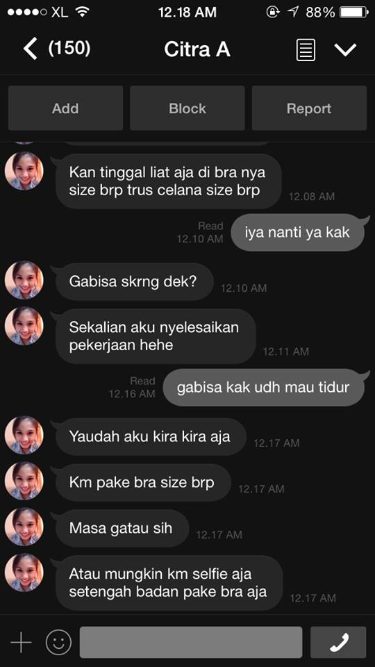 Predator: Ya sudah kirakira aja. Kamu pake bra size brp. Kan tinggal liat aja di bra nya. size brp trus celana size brp